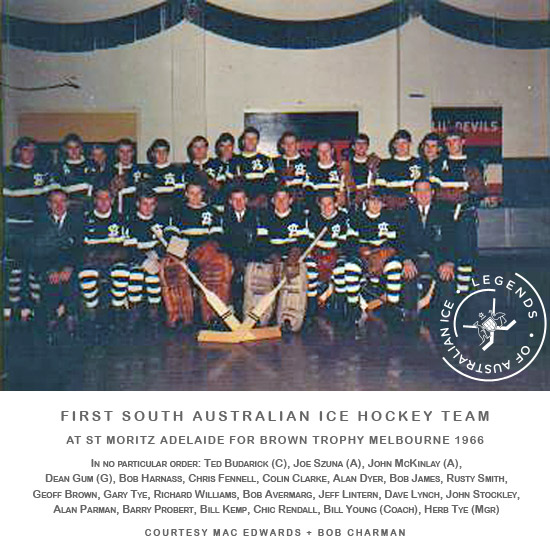 In 1966, the third season of hockey in the state, Bill Young formed the St Moritz Ice Hockey Club. It was the first state ice hockey association, and Young was the first president. That year in Melbourne, the first official State team launched. South Australia played for the Brown Trophy against New South Wales, Victoria and Queensland for the first time. Young was state coach, pitted against teams stacked with imported overseas players. The squad was: Ted Budarick (C), Joe Szuna (A), John McKinlay (A), local goalie Dean Gum, Bob Harnass, Chris Fennell, Colin Clarke, Alan Dyer, Bob James, Rusty Smith, Geoff Brown, Gary Tye, Richard Williams, Bob Avermarg, Jeff Lintern, Dave Lynch, John Stockley, Alan Parman, Barry Probert, Bill Kemp and Chic Rendall. Bill Young was Coach, and Herb Tye was the Team Manager.[13]