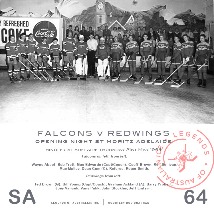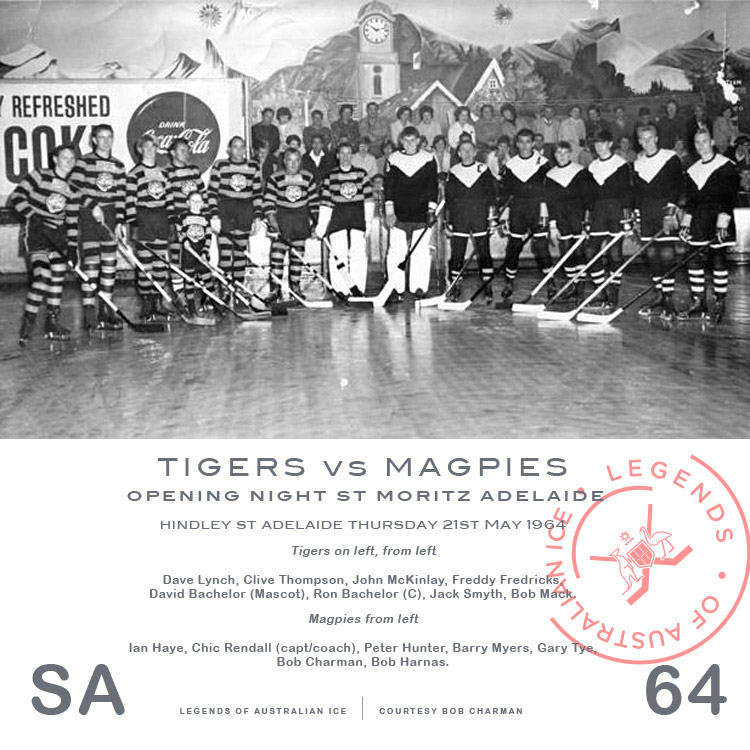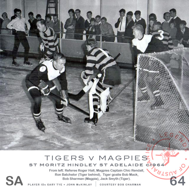 The Magpies, captained and coached by Chic Rendall, were Ian Haye, Peter Hunter, Barry Myers, Gary Tye, and goalie Bob Harnass who moved to the Redwings in 1966, won premierships in 1967 and 69 and became president of the state association in 71. Charman also later moved to the Redwings as a defenseman.[9]